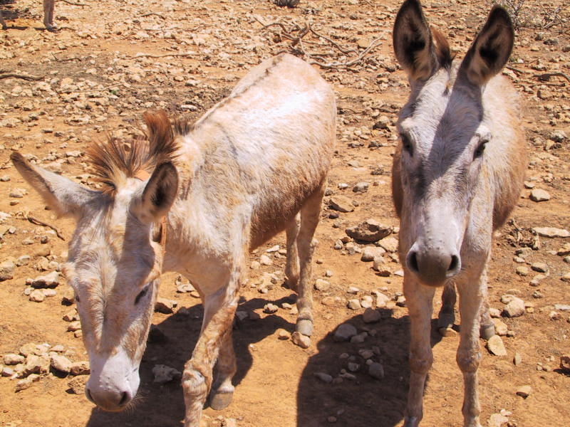 Es gibt viele wilde Esel auf Bonaire. Sie sind überhaupt nicht scheu und lassen sich streicheln. Leider werden sie aus diesem Grund auch immer wieder mal von Autos angefahren. Diese verwundeten Tiere werden dann im Donkey Sanctuary wieder gesund gepflegt. |