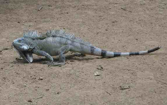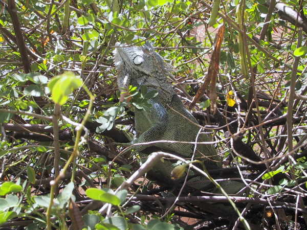 Der Iguana ist ein sehr scheuer Genosse. Gut getarnt sitzt er in den Büschen. Von manchen Einheimischen wird er als Aphrodisiakum sehr geschätzt. |